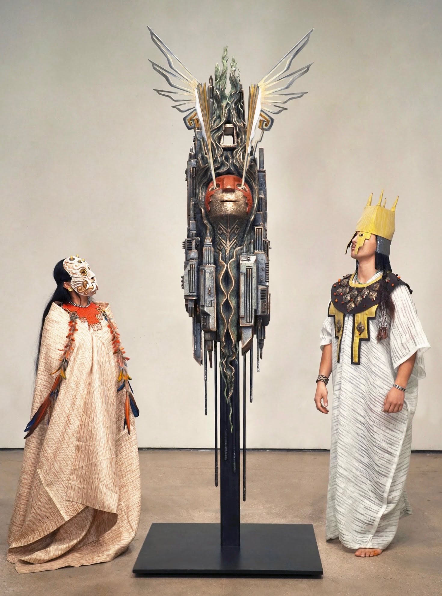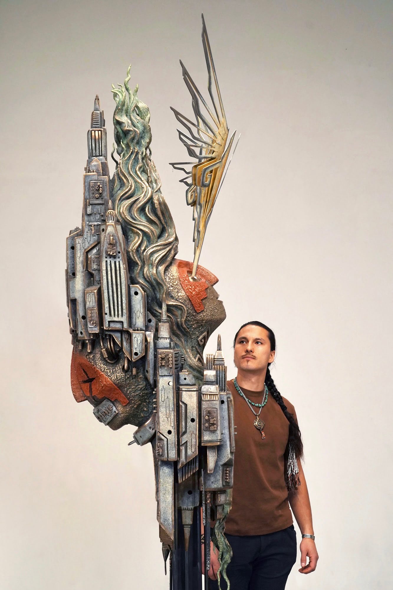 Description: Past, present, and future interwoven in a story of resistance, resilience, reemergence, and foresight. This art piece honors Indigenous Peoples of the Americas and our collective fight for decolonization, liberation, and sovereignty, through a visual language of Indigenous ancestral futurism.
